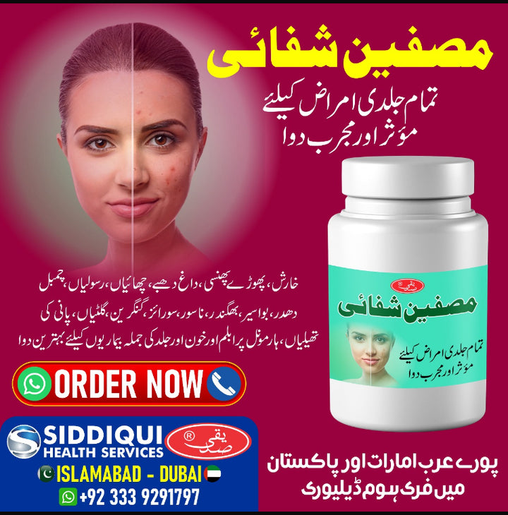 خارش، پھوڑے پھنسی، داغ دھبے، چھائیاں، رسولیاں، چمبل، دھدر، بواسیر، بھگندر، ناسور، سورائز، گنگرین، گلٹیاں، پانی کی تھیلیاں، ہارمونل پرابلم اور خون اور جلد کی جملہ بیماریوں کیلئے بہترین دوا